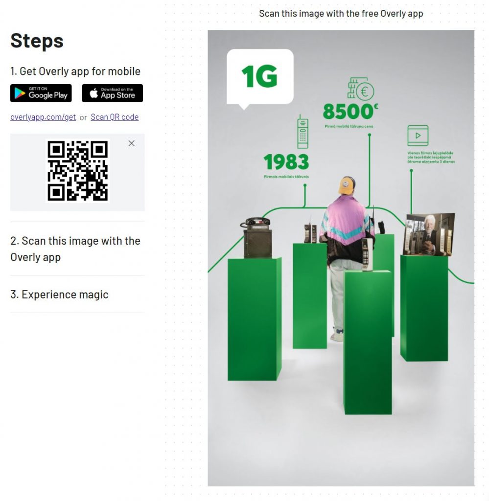 BITE Latvija, is planning to finish the 5G network deployment in Latvia by 2023. To educate the society about the meaning of 5G technology, the company teamed up with Overly. An evolutionary video tale covering the development from 1G up to 5G was created and hidden on an interactive exhibition stand. In five fun video snippets, which can be revealed when exploring the exhibit in augmented reality, a popular Latvian Radio DJ, Jānis Romonovskis, guides people through each stage of the network development.