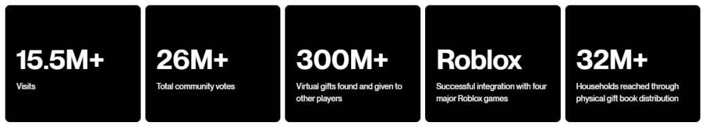 Amazon has successfully leveraged Roblox to promote their annual gift book through two distinct interactive experiences: “Amazon’s Holiday Dash” (2023) and “Amazon’s Joyful Horizons” (2024). These experiences have demonstrated remarkable growth in engagement metrics, with visits increasing from 7.7M in 2023 to 15.7M+ in 2024 (in just 5 months), showcasing the platform’s effectiveness for reaching new audiences and driving cross-platform engagement.
