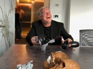 We are using Samsung Gear VR headsets to enable visitors to step inside the South African Dinaledi Chamber and controllers to pick up and inspect 3D scans of the fossil bone discoveries of a new species and the human relative made by the archeological team.