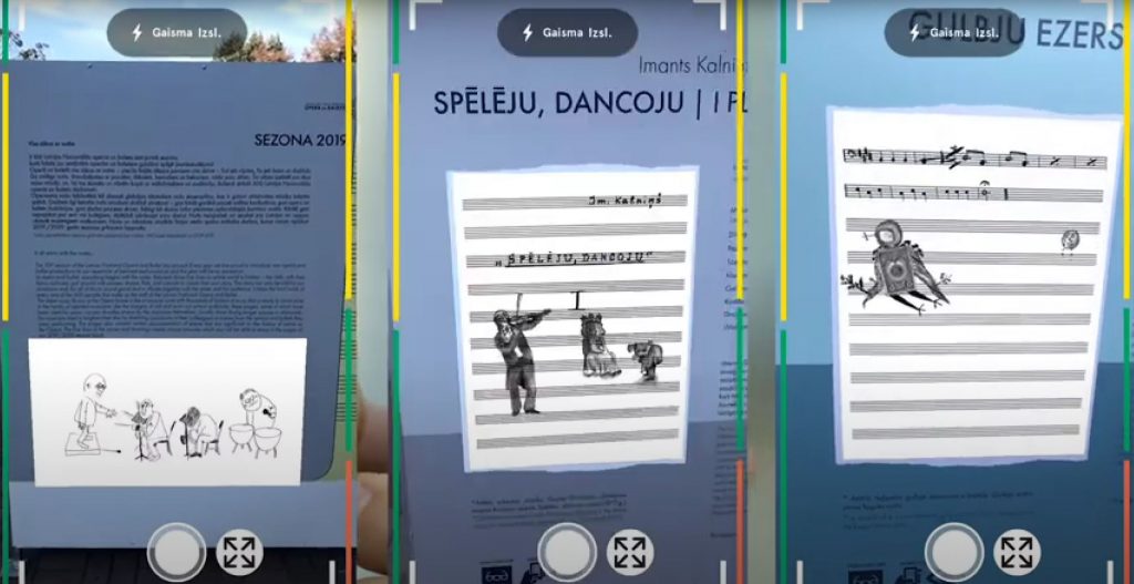 Augmented reality awakens musicians’ drawings on sheet music, giving a sneak peek of upcoming performances at the Latvian National Opera and Ballet.
