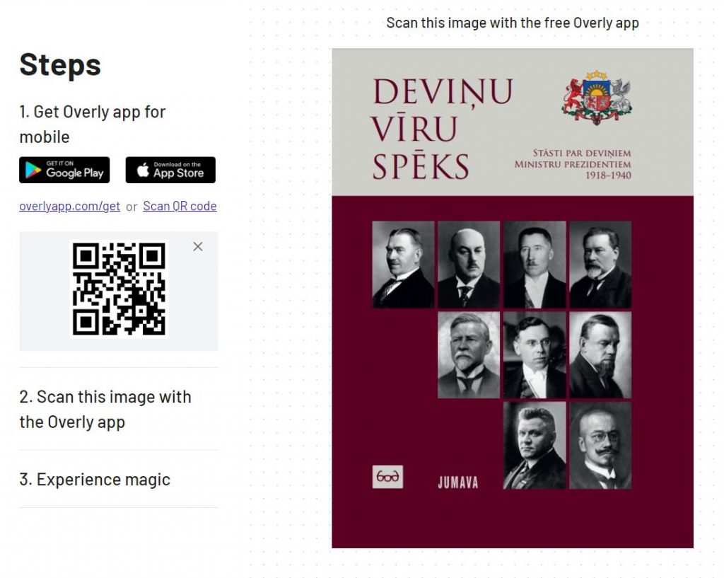 The first book across the Baltic States to feature augmented reality was launched by the Latvian State Chancellery in a respectful memory of the interwar period Latvian Prime Ministers. The book consists of nine chapters, each dedicated to one of the great men, featuring their portraits. Portraits can be scanned with the Overly app where additional insight is provided.
