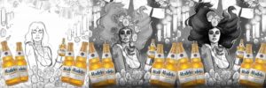 The front row of marigolds spill out as the woman’s arm reaches out from the mural wall out towards the viewer. It then transitions into a beautiful skeleton arm, decorated with sugar skull illustrations and motifs as it grabs the bottle and lifts it in celebration. With one finger, the woman then flicks the bottle cap off of the bottle and then reaches out to hand you the beer.
