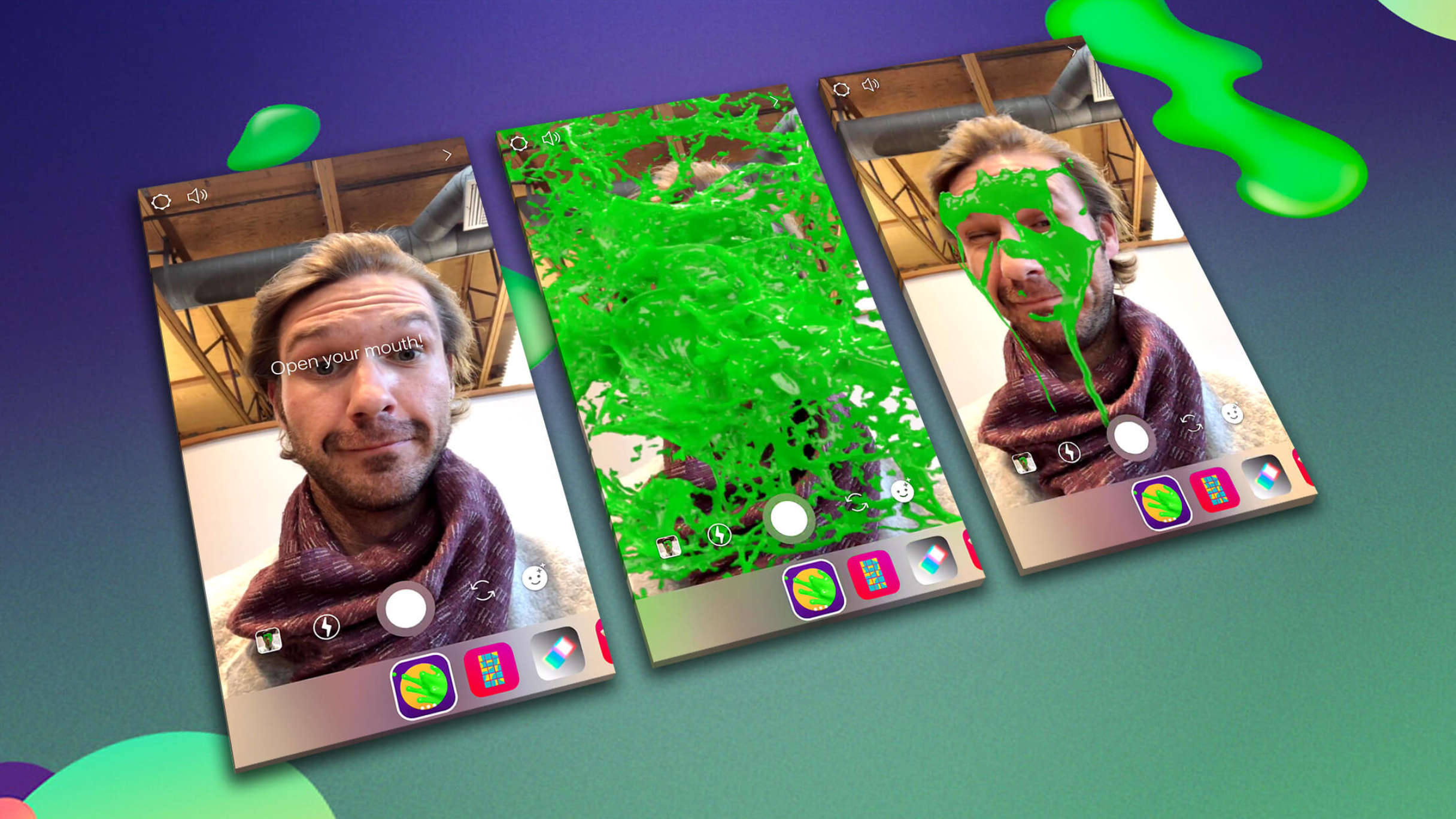 Upon initially launching the augmented reality Effect via Instagram stories, fans faces would be covered in slime. After the initial Slime, the user could continue to open their mouth or tap onscreen to activate endless Slime fun. This Effect was a multi-user experience that worked in selfie and world mode.