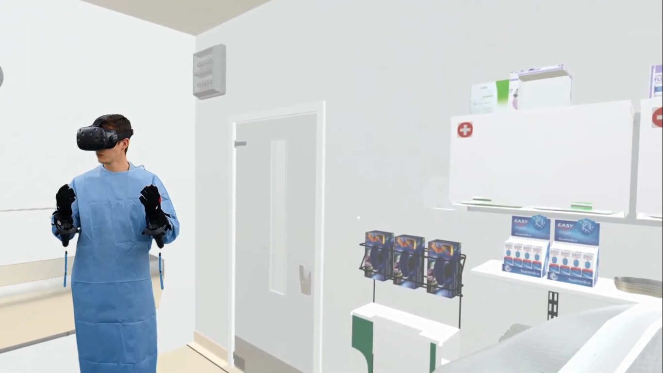 The VR training simulator demonstrates a correct approach to three key hygiene practices for healthcare workers: hand washing (hand hygiene, hand scrubs) , putting on (donning), and taking off (doffing) personal protective equipment (PPE). Motion capture examines each movement of a trainee and helps the VR application to determine an accuracy of the exercise performance.