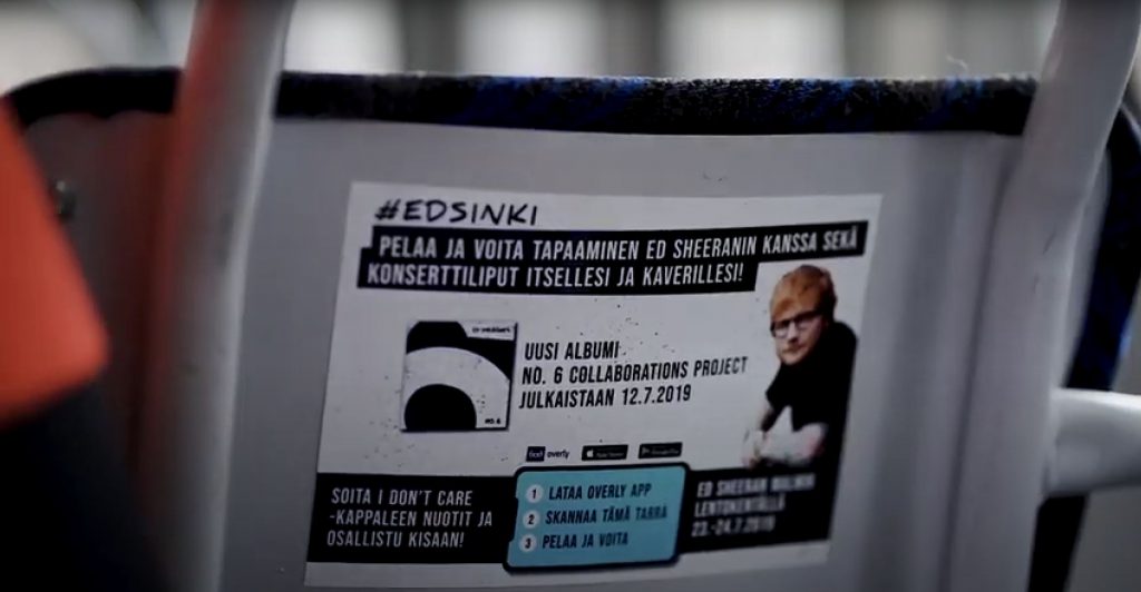 One fully branded Ed Sheeran bus took to the streets of Finland’s capital, Helsinki, covering thousands of miles over a two-week period before the star’s concert in the city. Inside the bus, every seat was branded with an interactive Ed Sheeran sticker. When scanned with the Overly app, it brought up an interactive menu with a Spotify playlist, album and ticket purchase options as well as a themed guitar hero game, featuring the star’s famous single with Justin Bieber “I don’t care”.