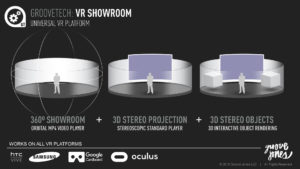 Inside the 360º VR Showroom, we are also able to display stereoscopic video on an oversized “Omni Theater” style viewing area. Participants can control the content using Gaze Controls, removing the need of any 3rd party hardware or controllers.