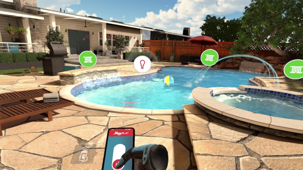 The VR demo takes place by the backyard pool and hot tub, where the participant learns how to replace their old pool heater and install the new AVIA system before a party.