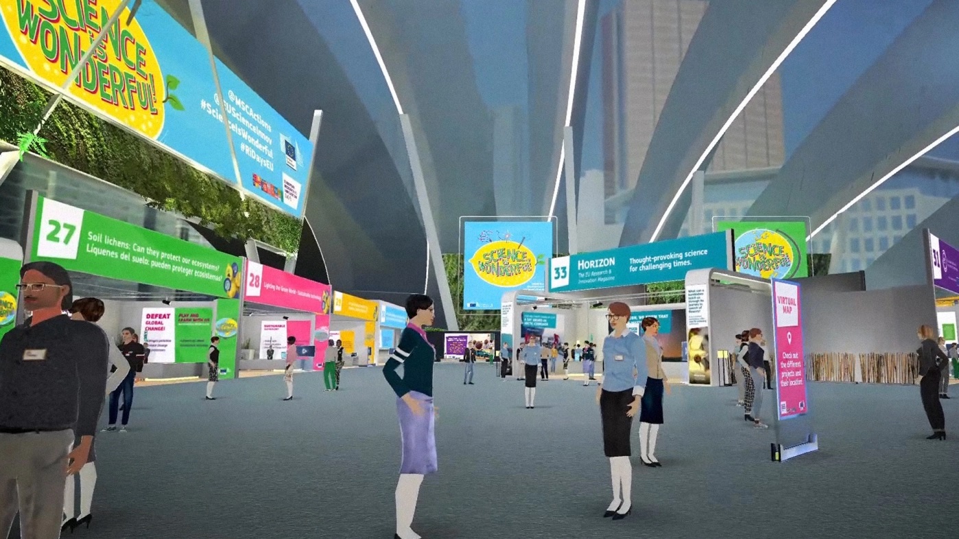 Yondr didn’t want to start from scratch and happily advised the Commission to use HyperFair, a virtual event space, plus a little help from them, obviously. Because HyperFair is an amazing tool, but just like an event venue in the real world, it can do with some personalisation. Yondr translated and implemented Science is Wonderful’s brand identity into HyperFair and built a complete virtual fair with boots, pavilions, a downloadable brochure, and personalised posters for every exhibitor.
