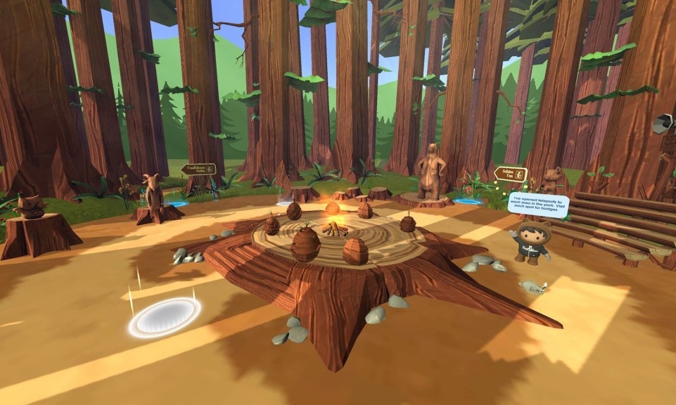 When users visit the Trailblazer Fields, they can listen to Podcasts of Salesforce customer success stories. They activate each story by opening a firefly jar on the log in front of them.
