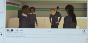 As an example, there’s on interaction where a boy is sitting at a table with a bag, and as the user approaches the boy, he puts the bag on a seat and says, “you can’t sit here, I’m waiting for someone”. Some young people will perceive that interaction as a threat and will feel they are disliked by that person. This situation helps adolescents to safely practice how they would respond in a real situation. On top of that, adolescents found the approach unthreatening and enjoyable.