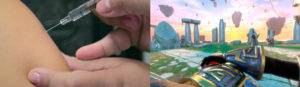 Fire and ice corresponded to cleaning the surface with alcohol and the actual vaccine shot. For the nurse to be able to rub the alcohol and administer the shot the exact same moment the children were given the superpowers, we created audio cues.